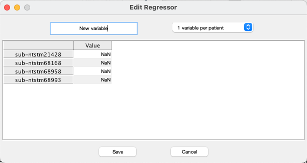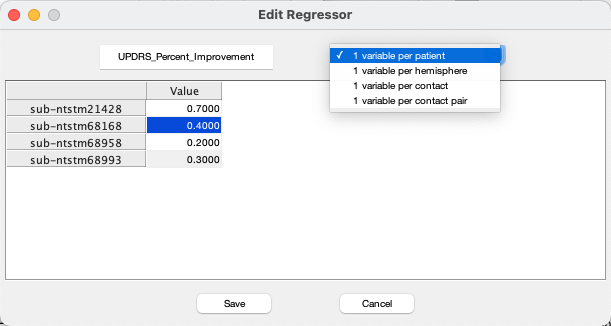 **5)** Next step is to add your variables of interest. To add a regressor, click the "+" sign below the Variables column. (fig 5.1) A window will pop up that allows you to enter the regressor for each patient and assign a name for this variable. (fig. 5.4) The default is 1 variable per patient. If your variables are per hemisphere, per contact or per contact pair, you can use the dropdown menu and select the suitable option. (fig. 5.5) If you need to change anything, you can click on "Review/Edit." (fig 5.2) Same window will pop up and it is possible to edit the titles and subscores. If you want to remove a variable, simply click on the "x" button. (fig 5.3) It is possible to add multiple variables. If you want to add another variable, repeat this process.