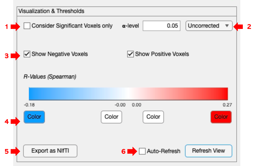 Visualization & Thresholding(Image 1, red arrow 2). Specifically, this step allows thresholding of the generated maps based on a predefined alpha level and correction for multiple comparisons (Image 3, arrows 1&2).Users can select to visualize voxels positively or negatively correlated with your selected dependent variable (Image 3, arrow 3) and change their color (Image 3, arrow 4).