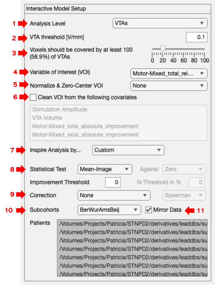Interactive Model Setup(Image 1, arrow 1) allows users to define methods and parameters to generate the computational model. One can define the analysis level, subcohort selection, dependent variable selection, covariates, statistical tests, and the option to mirror VTAs/Efields (Image 2, arrows 1-8).Analysis Level- allows users to simply select whether they want to use VTAs or E-Fields for their model. VTAs are stored in binary format [0 and 1], where all voxels within the VTA (voxels labelled as 1) are stimulated and all the voxels outside (voxels labelled as 0) are not stimulated. E-Fields are stored in a continuous fashion and contain information on the spatial distribution of the voltage. Based on the selection here, a further selection of options in "Inspire Analysis by ..." (Figure 2, arrow 1) will be determined.VTA/E-Field Threshold [V/mm]- determines what effect will be considered as “stimulating” (Figure 2, arrow 2).Voxels covered- Allows users to define the VTA/E-Field threshold required for voxels to be included in the model (Figure 2, arrow 3).Variable of Interest (VOI),Normalize & Zero-Center VOI&Clean VOI from the following covariates- (Figure 2, arrows 4-6)